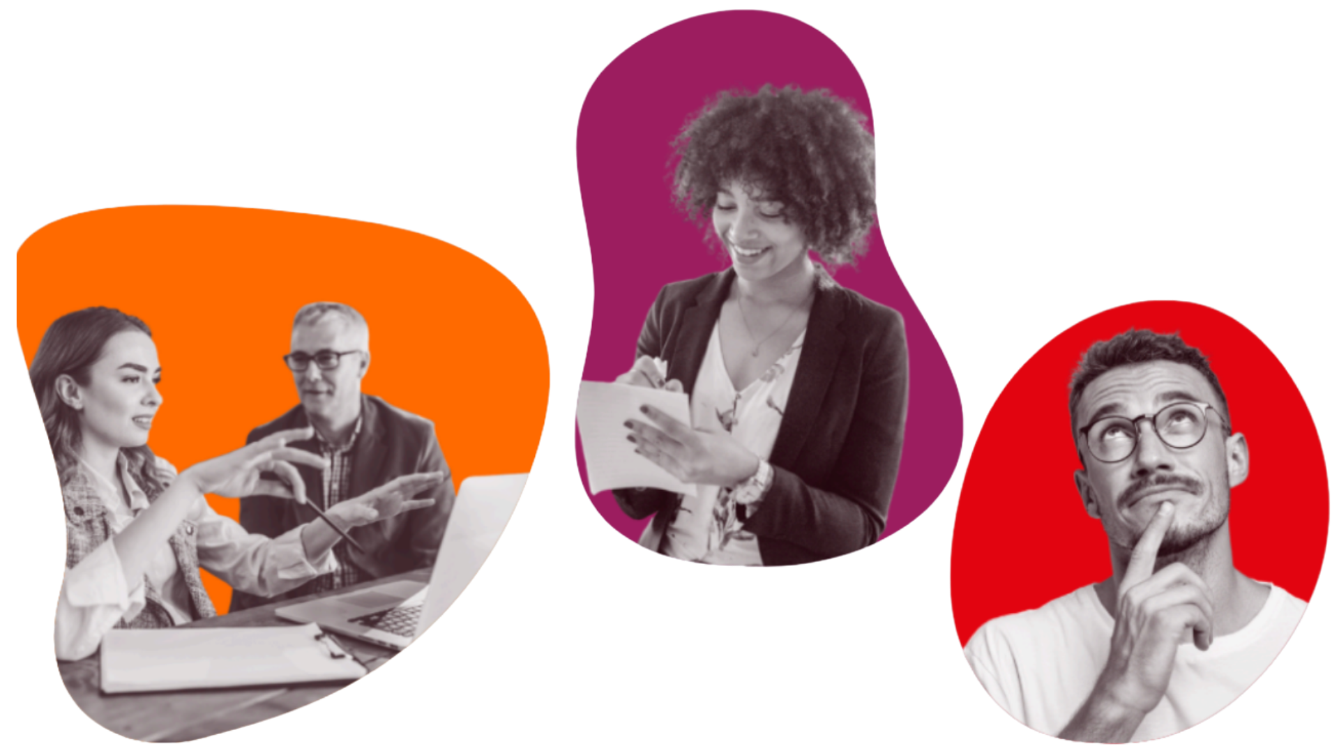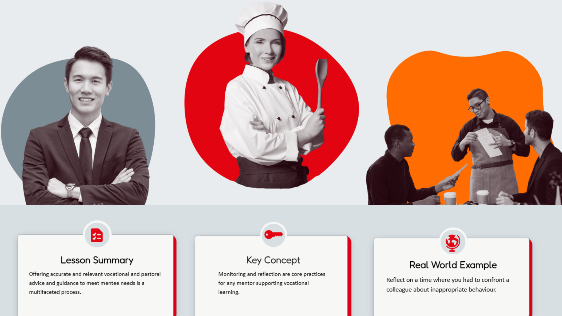 I established a cohesive visual system in which all imagery features real people paired with an abstract “blob” shape for containment and harmony. Blob shapes use brand colors or grey to reinforce identity while maintaining accessibility. A duotone treatment was introduced to reduce cognitive load, increase predictability, and enhance visual appeal without competing with core learning content.