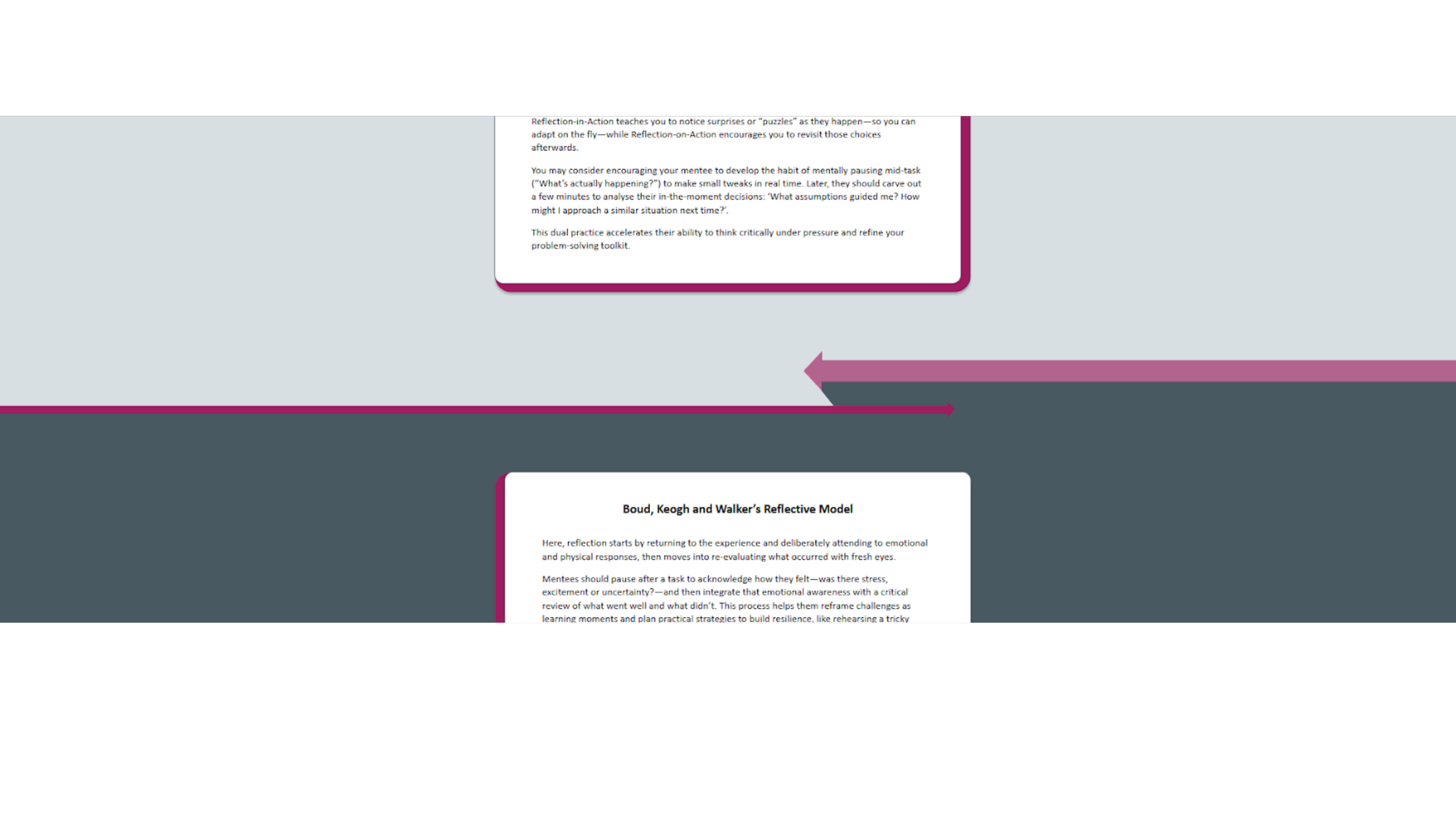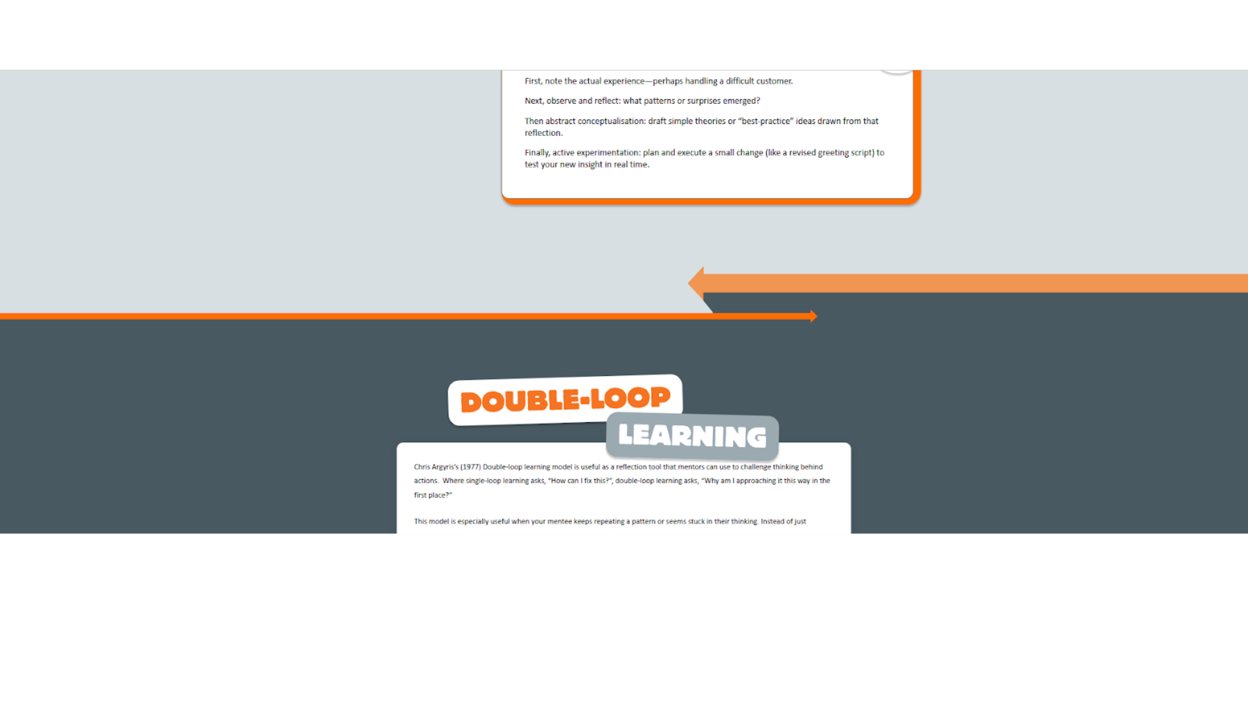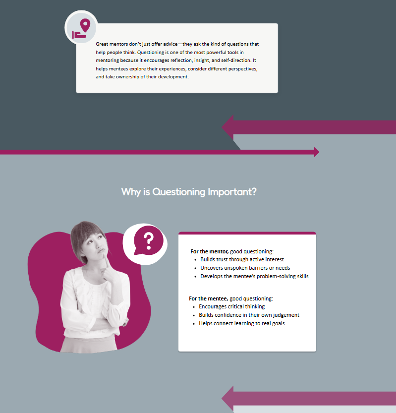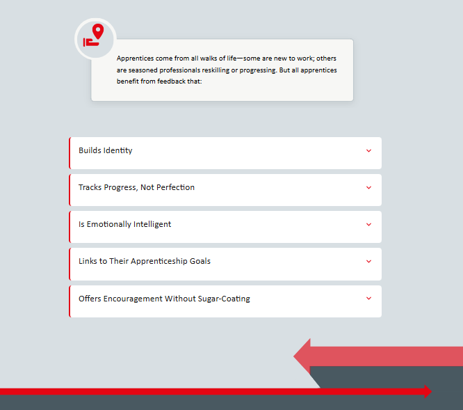 To create visual rhythm within a monochromatic grey brand palette, I designed a system of graphic dividers that add movement and hierarchy without compromising accessibility. Working within WCAG contrast standards, I introduced bold directional arrow motifs and structured color bands to guide the learner’s eye and reinforce progression between sections.