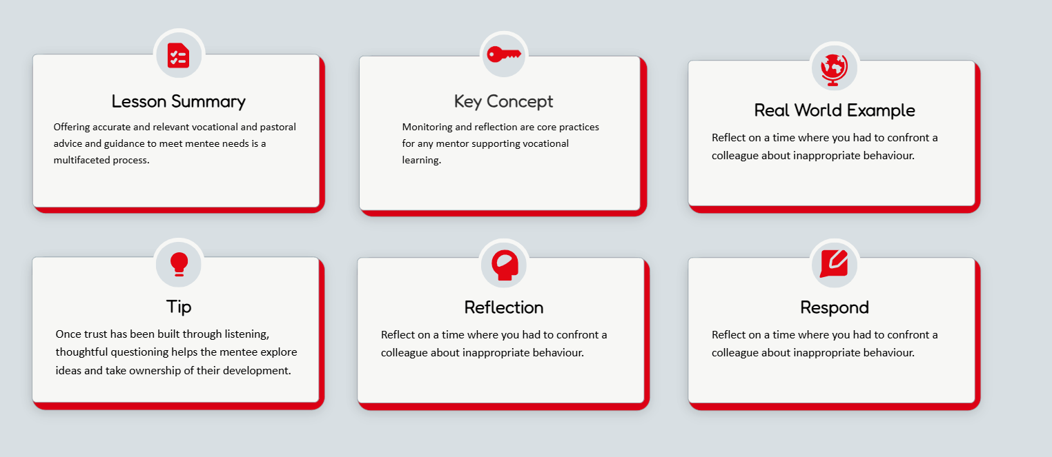 A defined set of key icons was established for specific instructional purposes and used consistently throughout. Additional icons from the approved library may be used for custom Rise blocks or Canva infographics, with limited flat-style exceptions. This structured approach ensures visual cues support learning rather than distract from it.